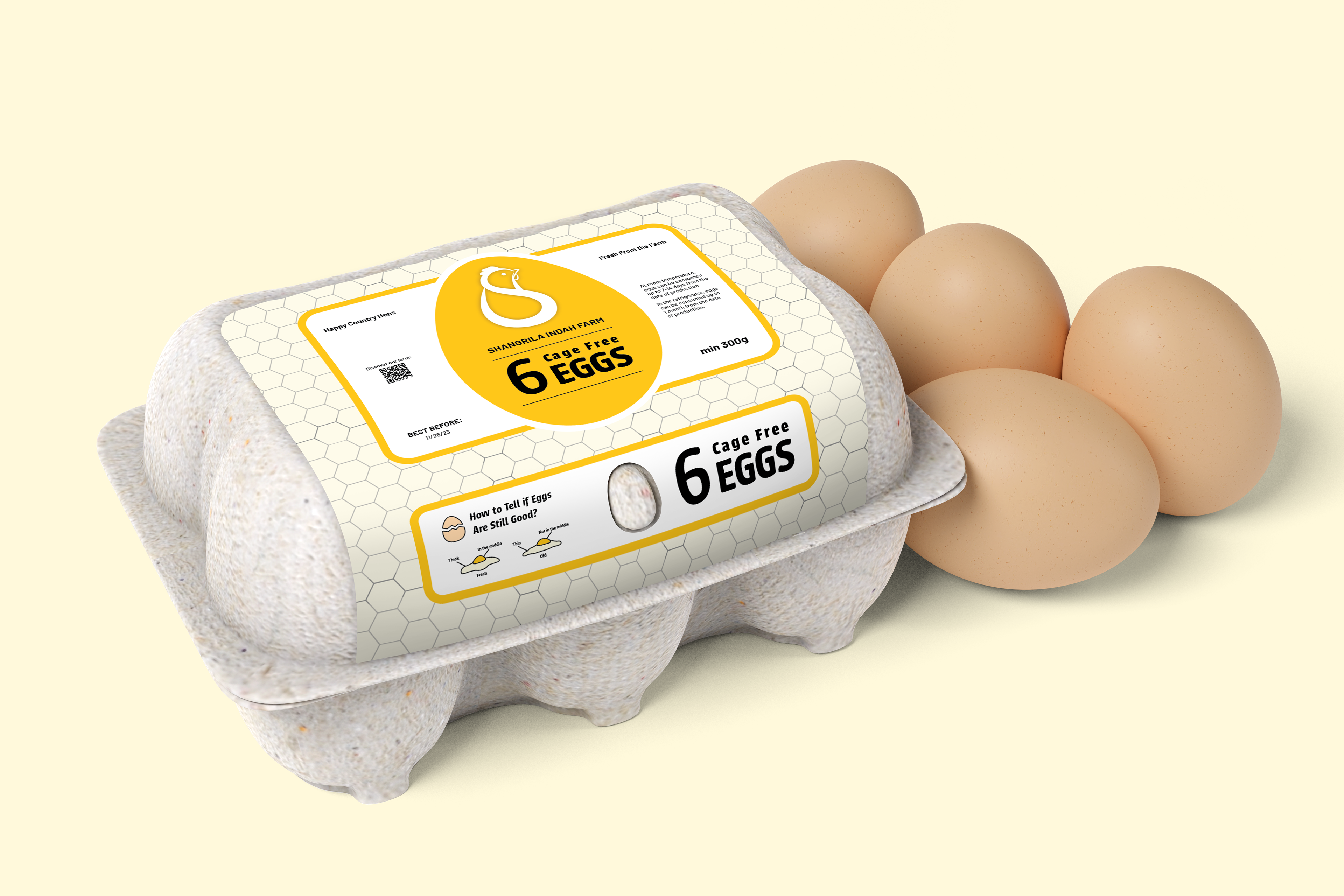 This egg packaging aims to distinguish the brand of eggs from competitors in the market, with a simple yet modern packaging design, visually combining eye-catching typography, vibrant colour and illustration to attract attention.